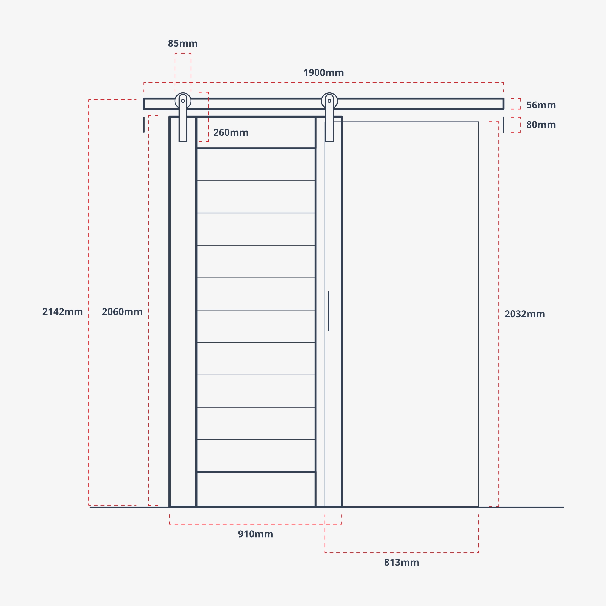 This product offers an innovative door solution tailored for doorway openings of 813mm x 2032mm, with the door dimensions being 910mm x 2060mm. The track is a black powder-coated aluminium track mounted above the doorway, eliminating the need for a floor track and reducing trip hazards.